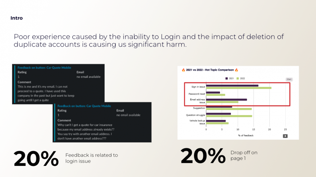 First step was to understand the scale of the problem and I looked at the feedback we receive via the online feedback collector and on customer service desk. We also analysed funnel drop off.